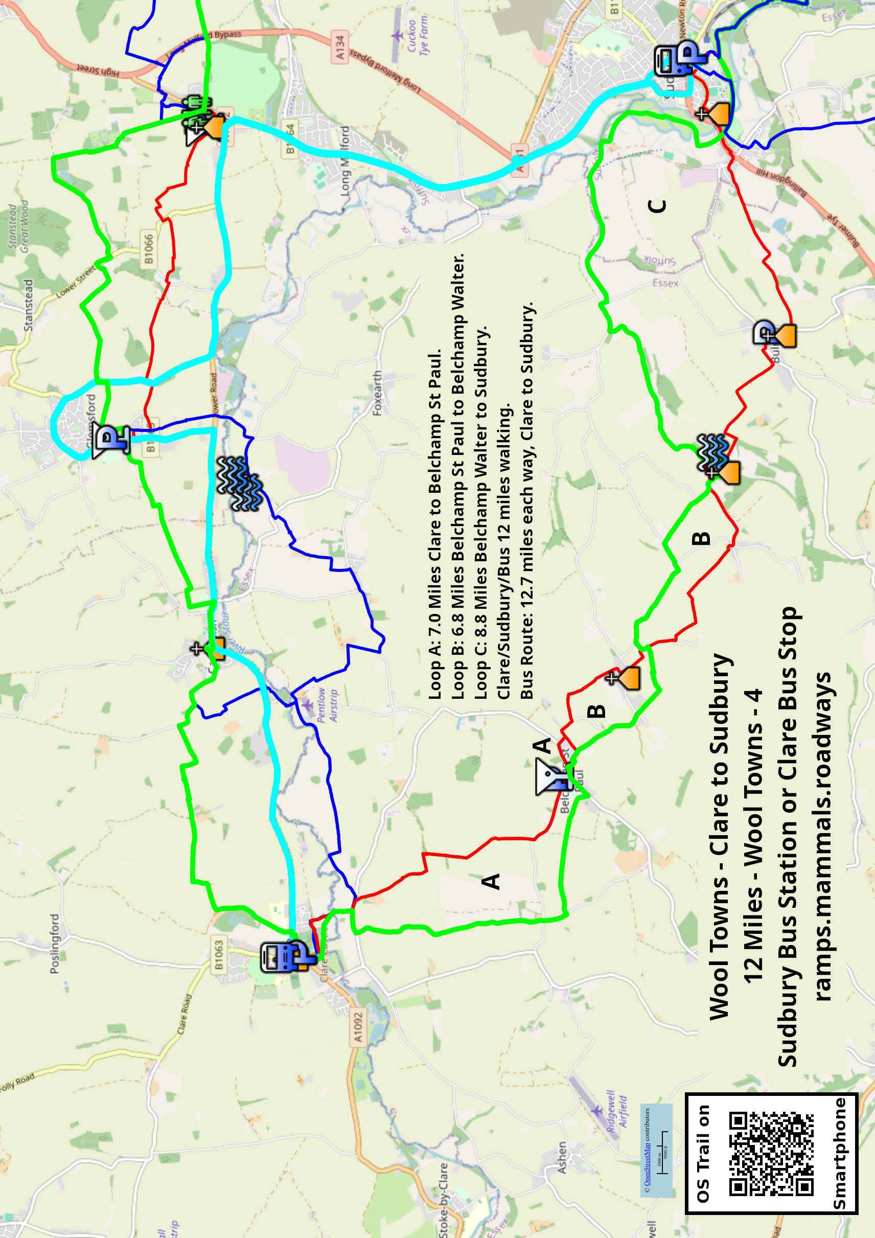 This walk can be done in two or three circular legs without using buses. See map. There is good street parking at Belchamp St. Paul (Half Moon) and also at Bulmer Saint Andrew's Church. There are P+D car parks at Sudbury and Clare Castle.